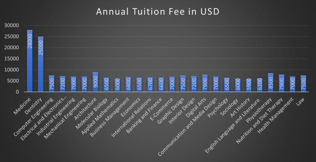As a private institution, Istanbul Arel University offers tuition fees that reflect the quality of its education and facilities. Costs vary depending on the level of study and the chosen program. For undergraduate degrees, annual tuition ranges from $3,500 to $8,000—with humanities programs at the lower end and engineering or medical programs at the higher end. Master’s programs typically cost between $4,000 and $6,000 per year, while doctoral programs range from $5,000 to $7,000 annually. Popular fields like medicine and dentistry come with higher tuition fees, often between $15,000 and $25,000 per year.