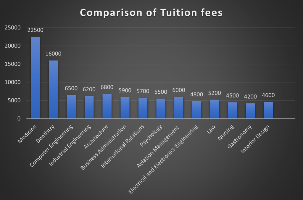 Istanbul Aydın University, as one of the reputable private universities in Turkey, offers various programs to ease the financial burden on students. Tuition fees vary depending on the level of study, the program, and the language of instruction. Generally, undergraduate tuition ranges from $3,500 to $8,000 per year, master’s programs range from $2,500 to $6,000, and doctoral programs range from $3,000 to $7,000. Popular fields like medicine and engineering tend to be at the higher end of these ranges. A positive aspect is that the university allows installment payments, enabling students to pay tuition in two or three installments throughout the academic year.